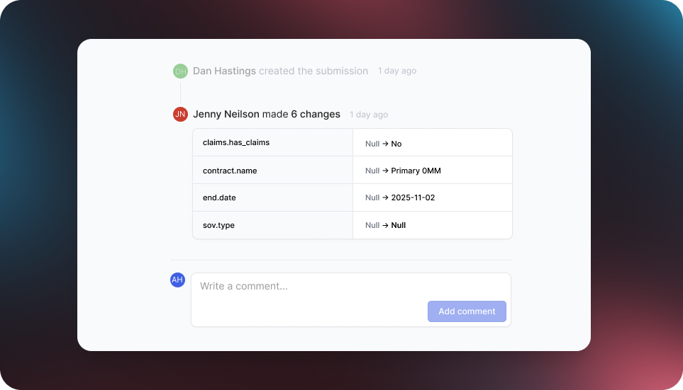 We’re transforming how our clients work on critical submissions by placing collaboration directly within the Artificial underwriting and placement platforms. We have introduced several new features designed to streamline communication and centralise activity, ensuring everyone is on the same page, at the same time: